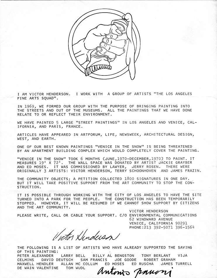 Ecology awareness and spirituality are not accidental themes involved in the message and intent of Terry Shoonhoven [sic], Vic Henderson, Leonard Koren and Jim Frazen [sic], our Venice artists who pooled their talents to create an art of the streets— large, quality paintings out in the open, accessible to anyone passing by.