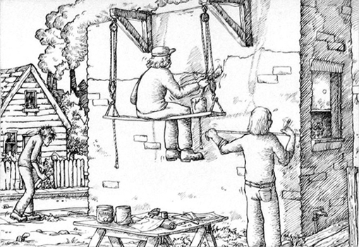 VENICE, CA: Valentine's Day, 1969 — Vic and Terry prepare the brick wall with Italian plaster, the kind the Renaissance painters of Italy used for their frescoes. Terry starts grid ding out the wall.