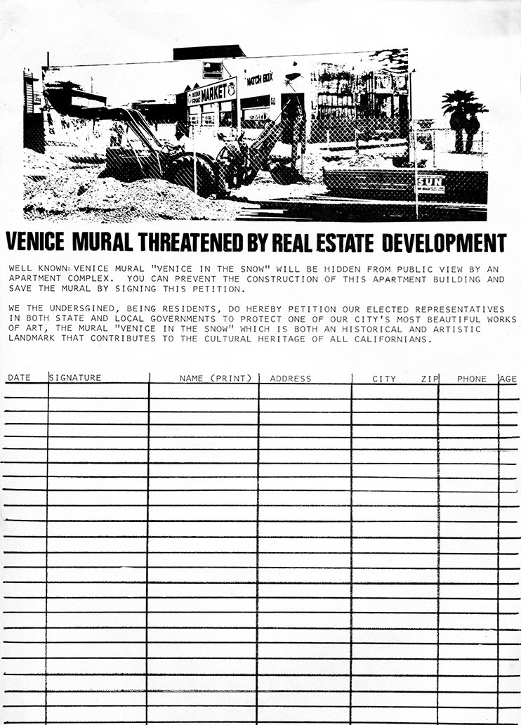 Located on Ocean front Walk and 18th St. in Venice, the painting is a mirror reproduction of a section of Ocean Front Walk a few blocks away. But the pleasure of recognition is jarred when the viewer realized that a fine layer of snow covers the palm trees and garbage cans and the sun is rising in the northeast through a stormy dark sky. The painting arouses speculation upon the temporary quality of our existence, possibilities of global upheavals, and, finally, the adaptability and endurability of man. Beachers, bicycle riders and motorists stop by the handful every day to gape at and enjoy the strange, uncomfortable feeling of mystery the painting inspires.