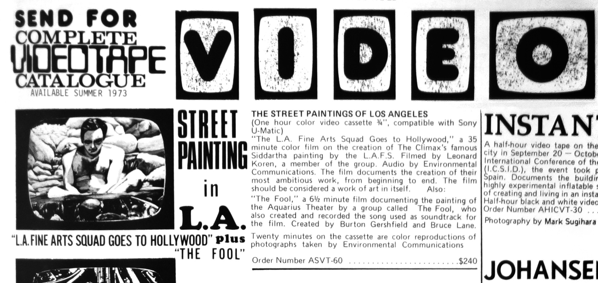 The four-person artist whose wall painting already present a Through the Looking Glass reflection on Brooks Avenue in Venice and a spiritual vision to astonish and awe harassed motorists passing the now defunct Climax nightclub on La Cienega, has just completed its third large work. Located on Ocean front Walk and 18th St. in Venice, the painting is a mirror reproduction of a section of Ocean Front Walk a few blocks away. But the pleasure of recognition is jarred when the viewer realized that a fine layer of snow covers the palm trees and garbage cans and the sun is rising in the northeast through a stormy dark sky. The painting arouses speculation upon the temporary quality of our existence, possibilities of global upheavals, and, finally, the adaptability and endurability of man. Beachers, bicycle riders and motorists stop by the handful every day to gape at and enjoy the strange, uncomfortable feeling of mystery the painting inspires. Ecology awareness and spirituality are not accidental themes involved in the message and intent of Terry Shoonhoven [sic], Vic Henderson, Leonard Koren and Jim Frazen [sic], our Venice artists who pooled their talents to create an art of the streets— large, quality paintings out in the open, accessible to anyone passing by. One very obvious problem that arises when an art work literally belongs to whomever views it, is the financial one. Many Fine Arts Squad fans feel the city of Los Angeles would do well to recognize and support this talent, the way New York City has sponsored some of its better known pop artists. In the meantime, the Fine Arts Squad is sumbolically [sic] selling their latest painting by the square, giving anyone who enjoys their work and wishes to see it continue, a chance to offer support. The squares, original sectioned for the purpose of laying out the painting, cost $5.00 each. Purchasers receive a unique certificate of ownership and the satisfaction of knowing that their donation helped support and alternative art, one that is place [sic] where it can be viewed and enjoyed by the people of Los Angeles. They can be reached by writing to L.A. Fine Arts Squad, 52 Brooks Ave., Venice, Calif.