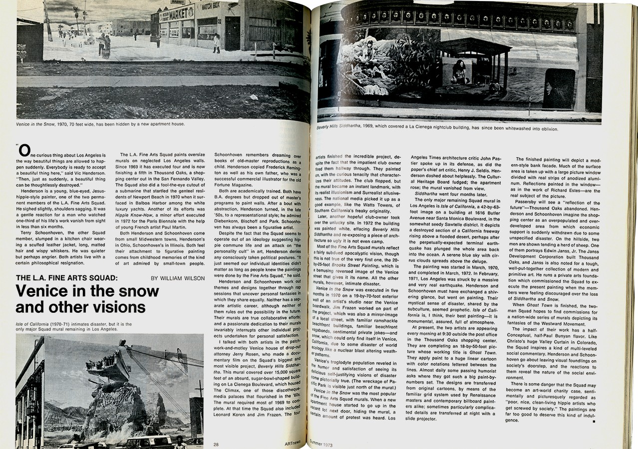 "One curious thing about Los Angeles is the way beautiful things are allowed to happen suddenly. Everybody is ready to accept a beautiful thing here," said Vic Henderson. "Then, just as suddenly, a beautiful thing can be thoughtlessly destroyed." Henderson is a young, blue-eyed, Jesus-hippie-style painter, one of the two permanent members of the L. A. Fine Arts Squad. He sighed slightly, shoulders sagging. It was a gentle reaction for a man who watched one-third of his life's work vanish from sight in less than six months. Terry Schoonhoven, the other Squad member, slumped in a kitchen chair wearing a scuffed leather jacket, long, matted hair and wispy whiskers. He was quieter but perhaps angrier. Both artists live with a certain philosophical resignation. The LA Fine Arts Squad paints oversize murals on neglected Los Angeles walls. Since 1969 it has executed four and is now finishing a fifth in Thousand Oaks, a shopping center out in the San Fernando Valley. The Squad also did a fool-the-eye cutout of a submarine that startled the genteel residents of Newport Beach in 1970 when it surfaced in Balboa Harbor among the white luxury yachts. Another 01 its efforts was Hippie Know-How, a minor effort executed in 1972 for the Paris Biennale with the help of young French artist Paul Martin. Both Henderson and Schoon hoven come from small Midwestern towns, Henderson's in Ohio, Schoonhoven's in Illinois. Both feel their attachment to figurative painting comes from childhood memories of the kind of art admired by small-town people. Schoonhoven remembers dreaming over books of old-master reproductions as a child. Henderson copied Frederick Remington as well as his own father, who was a successful commercial illustrator for the old Fortune Magazine. Both are academically trained. Both have B.A. degrees but dropped out of master's programs to paint walls. After a bout with abstraction, Henderson turned, in the late '50s, to a representational style; he admired Diebenkorn, Bischoff and Park. Schoonhoven has always been a figurative artist. Despite the fact that the Squad seems to operate out of an ideology suggesting hippie commune life and an attack on "the personality cult" in art, Henderson denies any consciously taken political postures. ''It just seemed our individual identities didn't matter as long as people knew the paintings were done by the Fine Arts Squad," he said. Henderson and Schoonhoven work out themes and designs together through rap sessions that uncover personal fantasies in which they share equally. Neither has a separate artistic career, although neither of them rules out the possibility in the future.Their murals are true collaborative efforts: and a passionate dedication to their murals invariably interrupts other individual projects undertaken for personal satisfaction. I talked with both artists in the patchwork-and-motley Venice house of drop-out attorney Jerry Rosen, who made a documentary film on the Squad's biggest and most visible project, Beverly Hills Siddhartha. This mural covered over 15,000 Squall feet of an absurd , sugar-bowl-shaped building on La Cienega Boulevard, which housed The Climax, one of those discotheque-media palaces that flourished in the '60s. The mural required most of 1969 to complete. At that time the Squad also included Leonard Koren and Jim Frazen. The four artists finished the incredible project, despite the fact that the impatient club owner fired them halfway through. They painted on, with the curious tenacity that characterizes their attitudes. The club flopped, but the mural became an instant landmark, with its realist illusionism and Surrealist allusiveness. The national media picked it up as a good example, like the Watts Towers, of Southern California's freaky originality. Later, another hopeful club-owner took over the unlucky site. In 1972 the building was painted white, effacing Beverly Hills Siddhartha and re-exposing a piece of architecture so ugly it is not even camp. Most of the Fine Arts Squad murals reflect a fairly subdued apocalyptic vision, though this is not true of the very first one, the 20-by-25-foot Brooks Street Painting, which is a bemusing reversed image of the Venice street that gives it its name. All the other murals, however, intimate disaster. Venice in the Snow was executed in five months in 1970 on a 19-by-70-foot exterior wall of an artist's studio near the Venice boardwalk. Jim Frazen worked on part of the project, which was also a mirror-image of a local street, with familiar ramshackle, beachfront buildings, familiar beachfront vagabonds, sentimental private jokes—and snow, Which could only find itself in Venice, California, due to some disaster of world ecology. Like a nuclear blast altering weather patterns. Venice 's troglodyte population reveled in the humor and satisfaction of seeing its delicious self-justifying visions of disaster come pictorially true. (The wreckage of Pacific Park is visible just north of the mural.) Venice in the Snow was the most popular of the Fine Arts Squad murals. When a new apartment house started to go up in the vacant lot next door, hiding the muraI, a certain amount of protest was heard. Los Angeles Times architecture critic John Pastier spoke up in its defense, as did the paper's chief art critic, Henry J. Seldis. Henderson dashed about helplessly. The Cultural Heritage Board fudged; the apartment rose; the mural vanished from view. Siddhartha went four months later. The only major remaining Squad mural in Los Angeles is Isle of California, a 42-by-63-foot image on a building at 1616 Butler Avenue near Santa Monica Boulevard, in the somewhat seedy Sawtelle district. It depicts a destroyed section of a California freeway rising above a flooded desert, perhaps after the perpetually-expected terminal earth quake has plunged the whole area back into the ocean. A serene blue sky with cirrus clouds spreads above the deluge. The painting was started in March, 1970, and complete