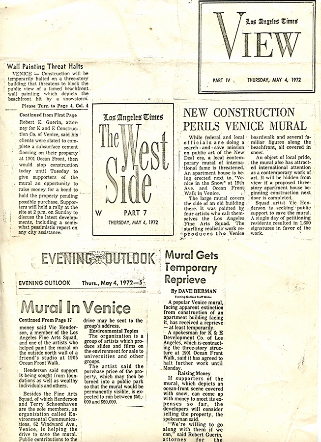 A popular Venice mural, facing apparent extinction from construction of an apartment building facing it, has receive a reprieve—at least temporarily. A spokesman for K & E Development Co. of Los Angeles, which is contracting the three-story structure at 1901 Ocean Front Walk, said it has agreed to halt further work until Monday. Raising Money If supporter of the mural, which depicts an ocean-front scene covered with snow, can come up with money to meet its expenses so far, the developers will consider selling the property, the spokesman said. "We're willing to go along with them if we can," said Robert Guerin, attorney for the [section missing] [section missing] money said Vic Henderson, a member of the Los Angeles Fine Arts Squad, and one of the artists who helped paint the mural on the outside north wall of a friend's studio at 1905 Ocean Front Walk. Henderson said support is being sough from foundations as well as wealthy individuals and others. Besides the Fine Arts Squad, of which Henderson and Terry Schoon hoven are the sole members, an organization called Environmental Communications, 63 Windward Ave., Venice, is helping the drive to save the mural. Public contributions to the drive can be sent to the group's address. Environmental TopicsThe organization is a group of artists which produce slides and films on the environment for sale to universities and other groups. The artist said the purchase price of the property, which may then be turned into a public park so that mural would be permanently visible, is expected to run between $50,000 and $60,000.