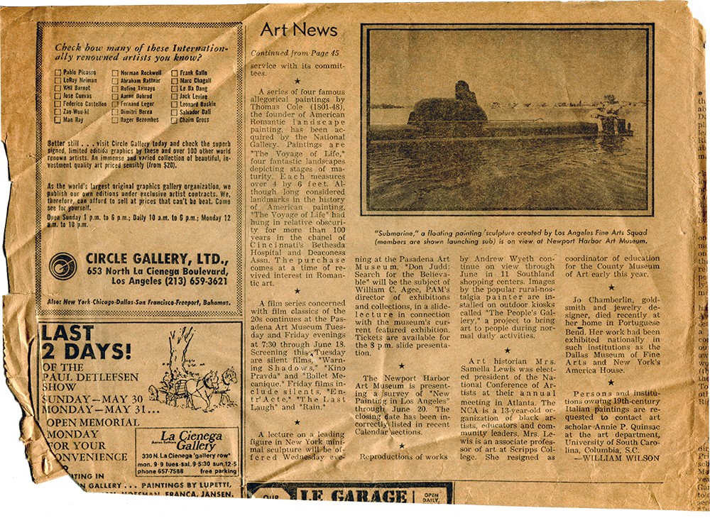 The Newport Harbor Art Museum is presenting a survey of "New Painting in Los Angeles" through June 20. The closing date has been incorrectly listed in recent Calendar sections. Caption: "Submarine," a floating painting/sculpture created by Los Angeles Fine Arts Squad (members are shown launching sub) is on view at Newport Harbor Art Museum.