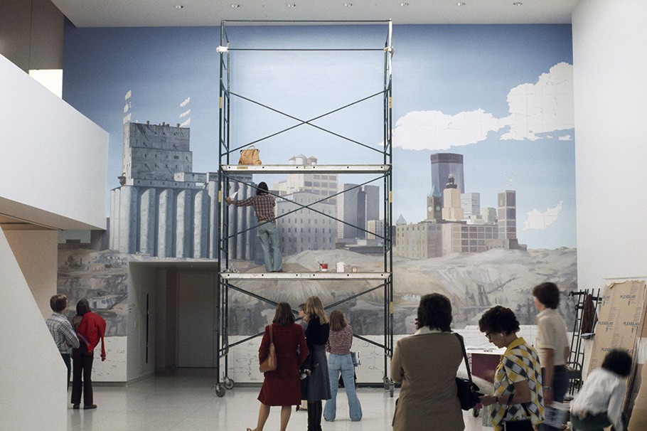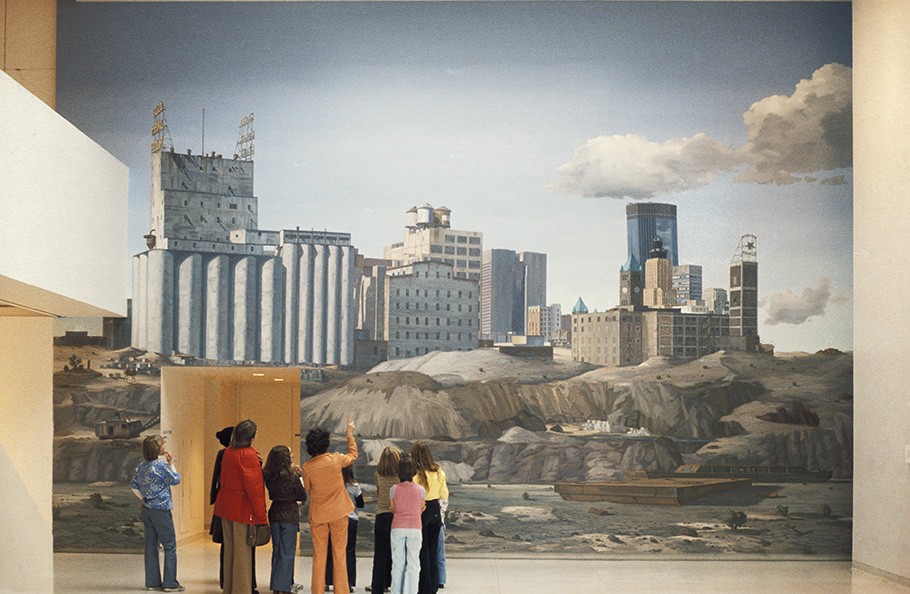 American muralist Terry Schoonhoven was commissioned by the Walker Art Center to create his mural No River Wall Painting for the 1976 exhibition The River: Images of the Mississippi. It loomed large—24 by 35 feet—and foreboding in the Walker’s outer lobby, depicting the riverfront as dystopian industrial district, going to rack and ruin in mounding decay, a parched riverbed supporting barges going nowhere and tipped oil drums lodged in the scorched silt. Meanwhile, just off in the distance, gleaming new city buildings emerge—reaching up and away from the riverfront and the industry of the past.